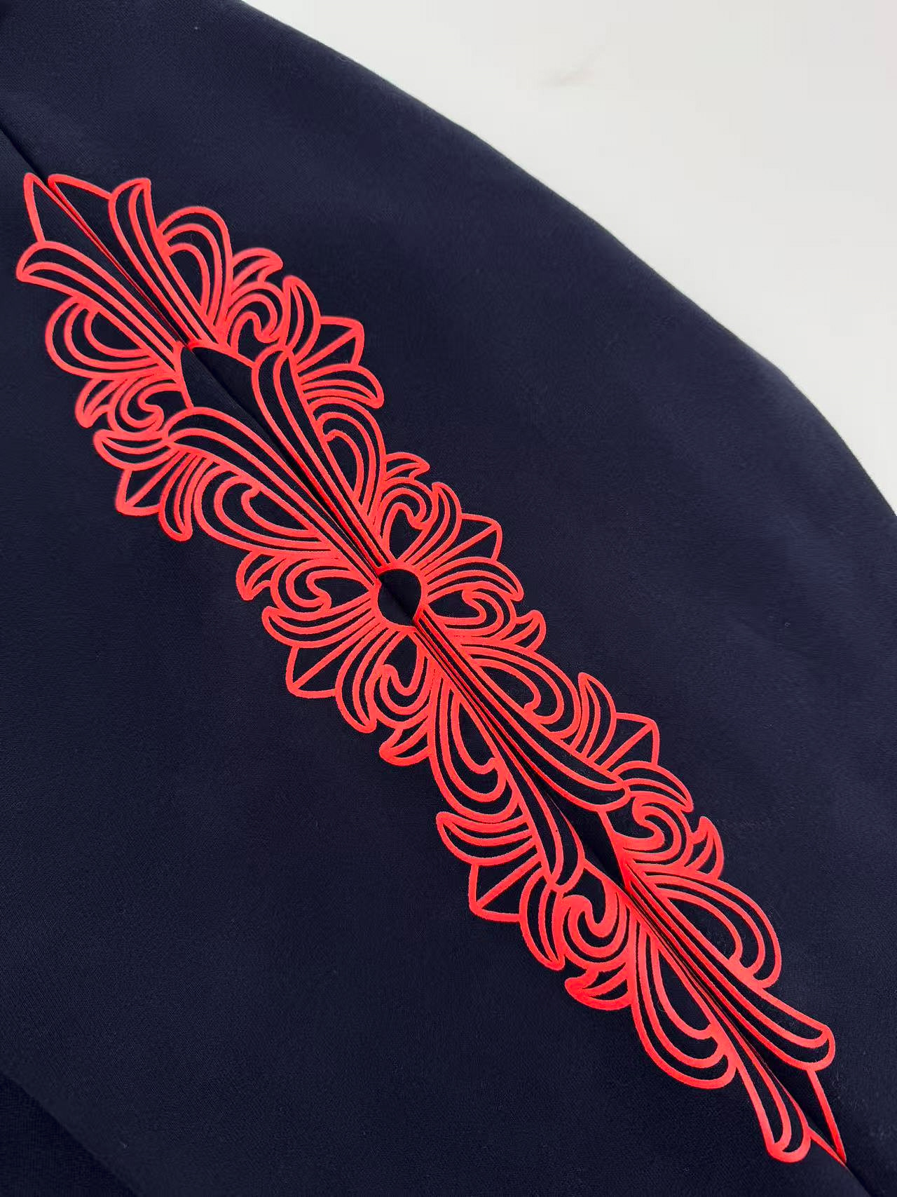 • 採用澳絨柔緞科技棉,質感卓越且舒適貼膚。整體以午夜海軍藍渲染,低調中蘊含貴氣;三種形態的紅色馬蹄花寫實印花,宛如潮流火焰在宣紙上自然暈染,輕鬆掌控視覺焦點。