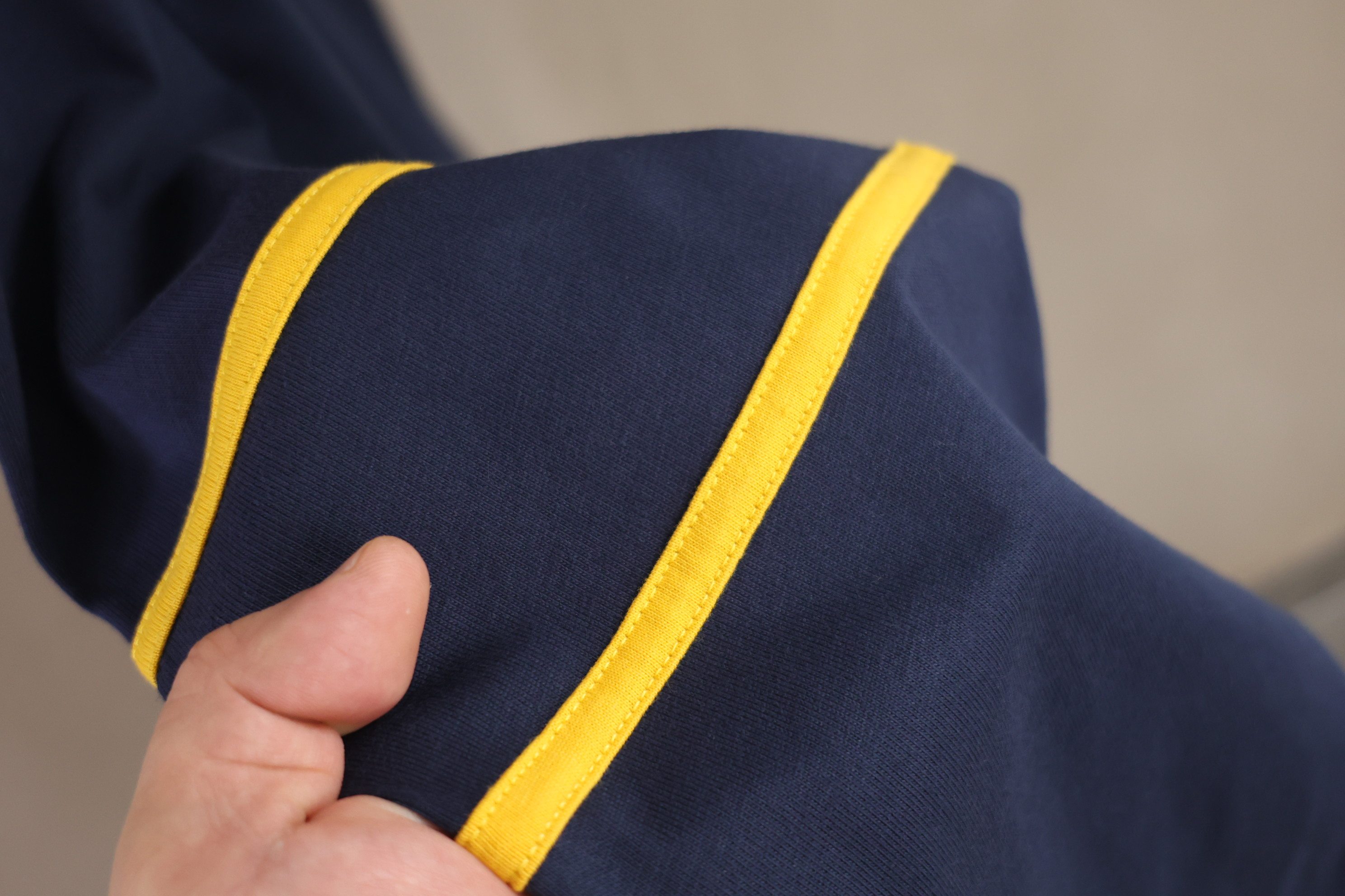 藏青色衣身+亮黃撞色領口,長袖袖章點綴,學院風濃郁