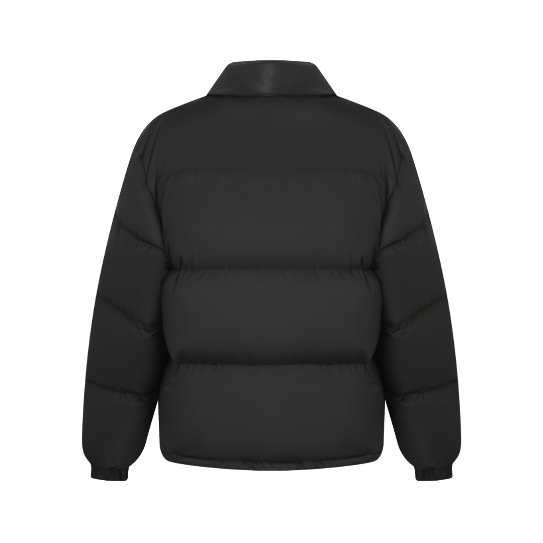 領口選用高質量黑色皮革材質,與衣身主體形成豐富的視覺層次感,同時能保持完美的立體翻折形態,