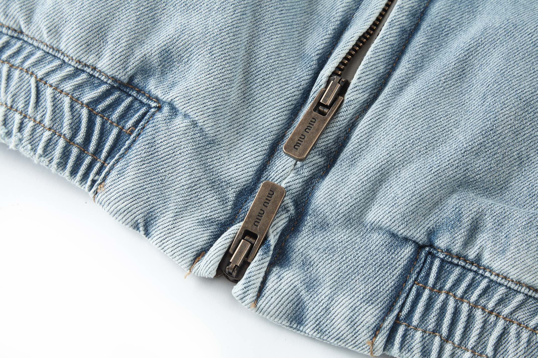 刺繡部分運用雷射燒花工藝,以衣身原有牛仔布製作出「MIU MIU」標識,圖案底部複合粘膠使立體效果更為突出,經人工定位贴合後,再透過電腦刺繡完成成品。