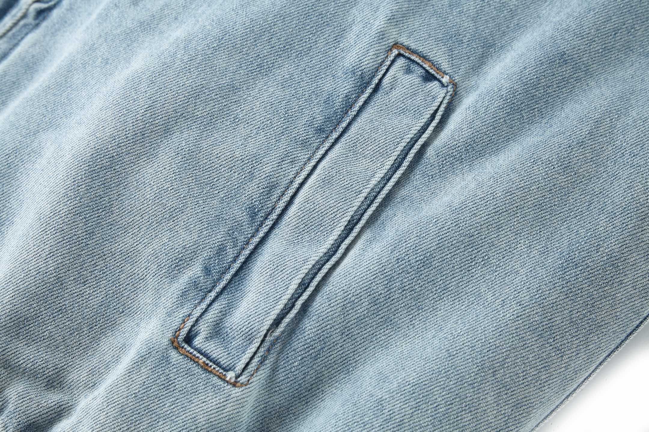 採用 7×10 斜紋牛仔布,厚度為 11 盎司,洗水後衣身主面料克重約 400 克。