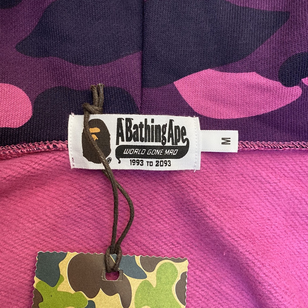 • 双经典元素碰撞,潮流辨识度拉满:这款卫衣将 BAPE 的两大标志性元素 ——1ST CAMO 经典迷彩与鲨鱼造型完美融合,堪称街头潮牌的标志性设计。6 种丰富迷彩配色各有风格,迷彩黄亮眼吸睛、迷彩绿自带复古军潮范,迷彩红、迷彩紫打破常规更显个性,迷彩蓝和迷彩灰则低调百搭适配多种场景。机印工艺打造的迷彩图案色彩饱满均匀,图案比例规整,搭配正面醒目的鲨鱼造型设计,拉上拉链时鲨鱼轮廓与迷彩纹理相互映衬,街头气场直接拉满,不管是潮人聚集地打卡还是日常出街,都能轻松成为视线焦点,是潮圈辨识度极高的吸睛单品。