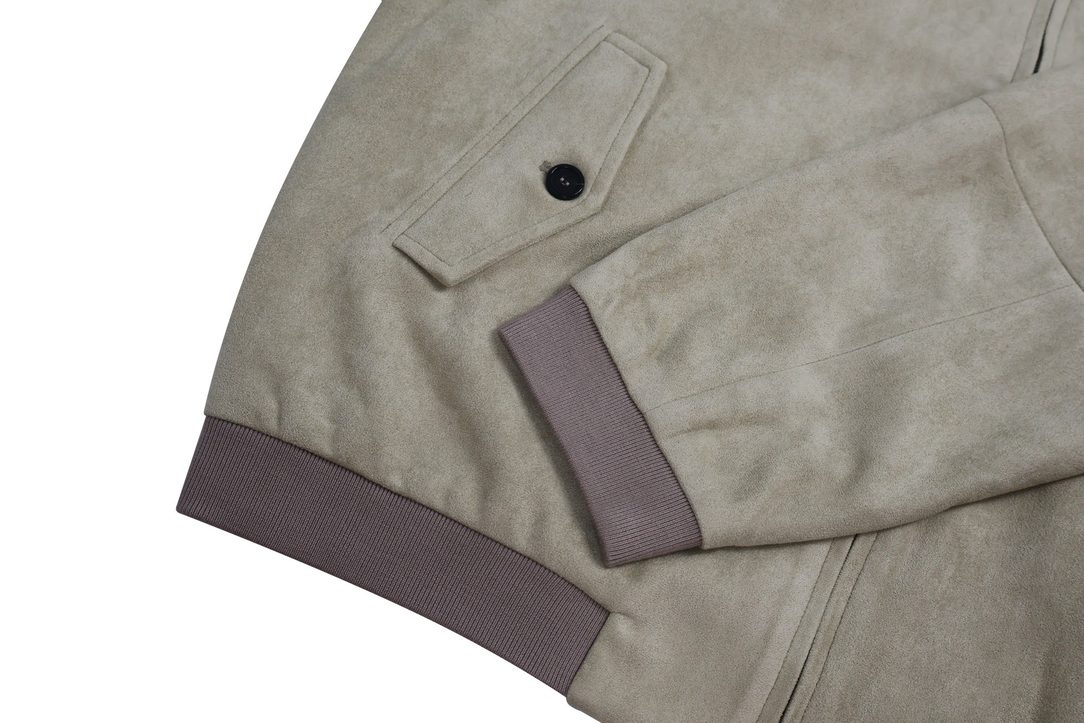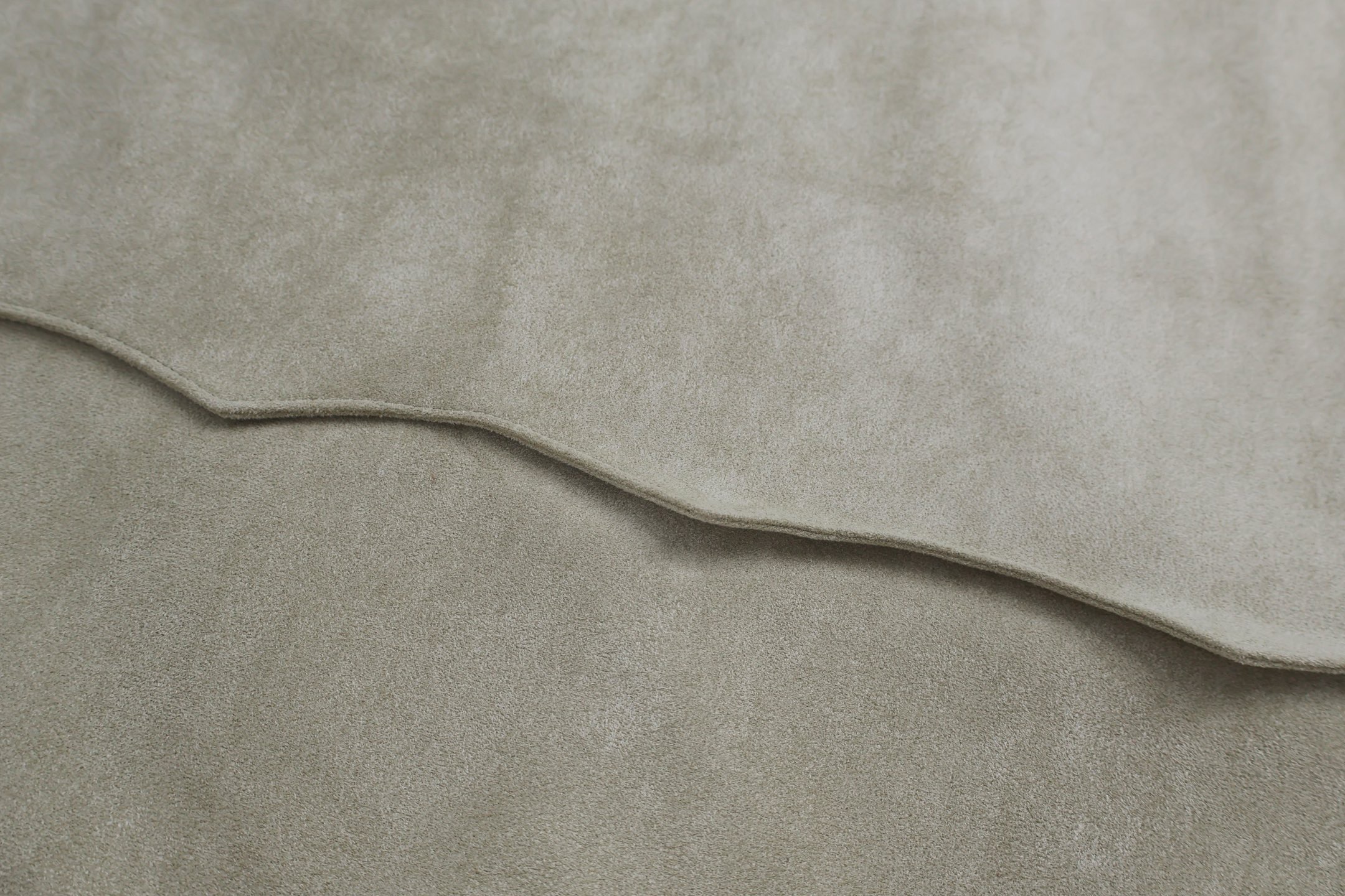面料採用義大利絨麂皮材質,搭配 50 克針織復合面料;同時選用定製 101 啞光灰綠色皮革,