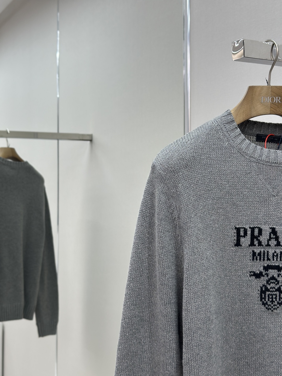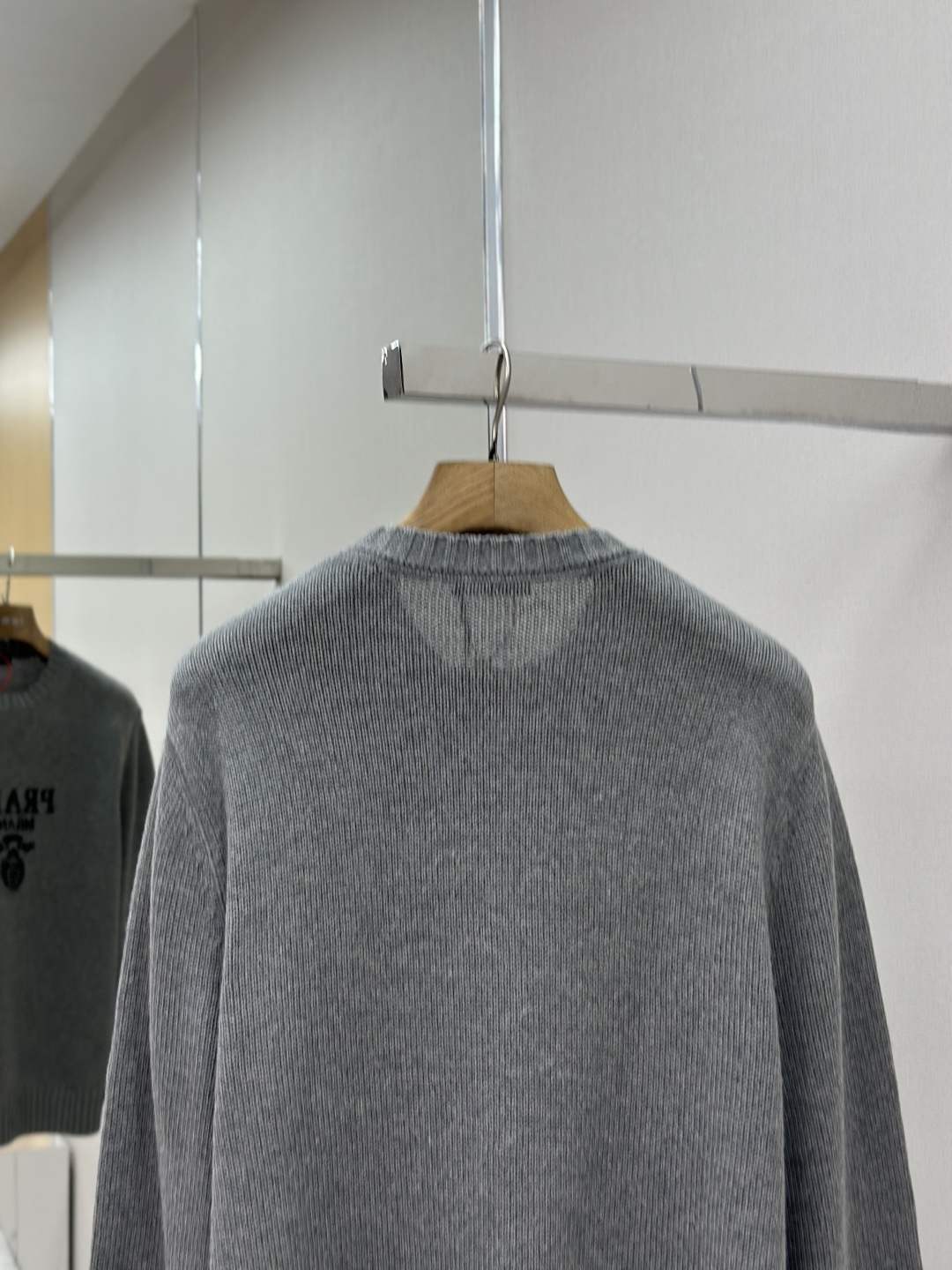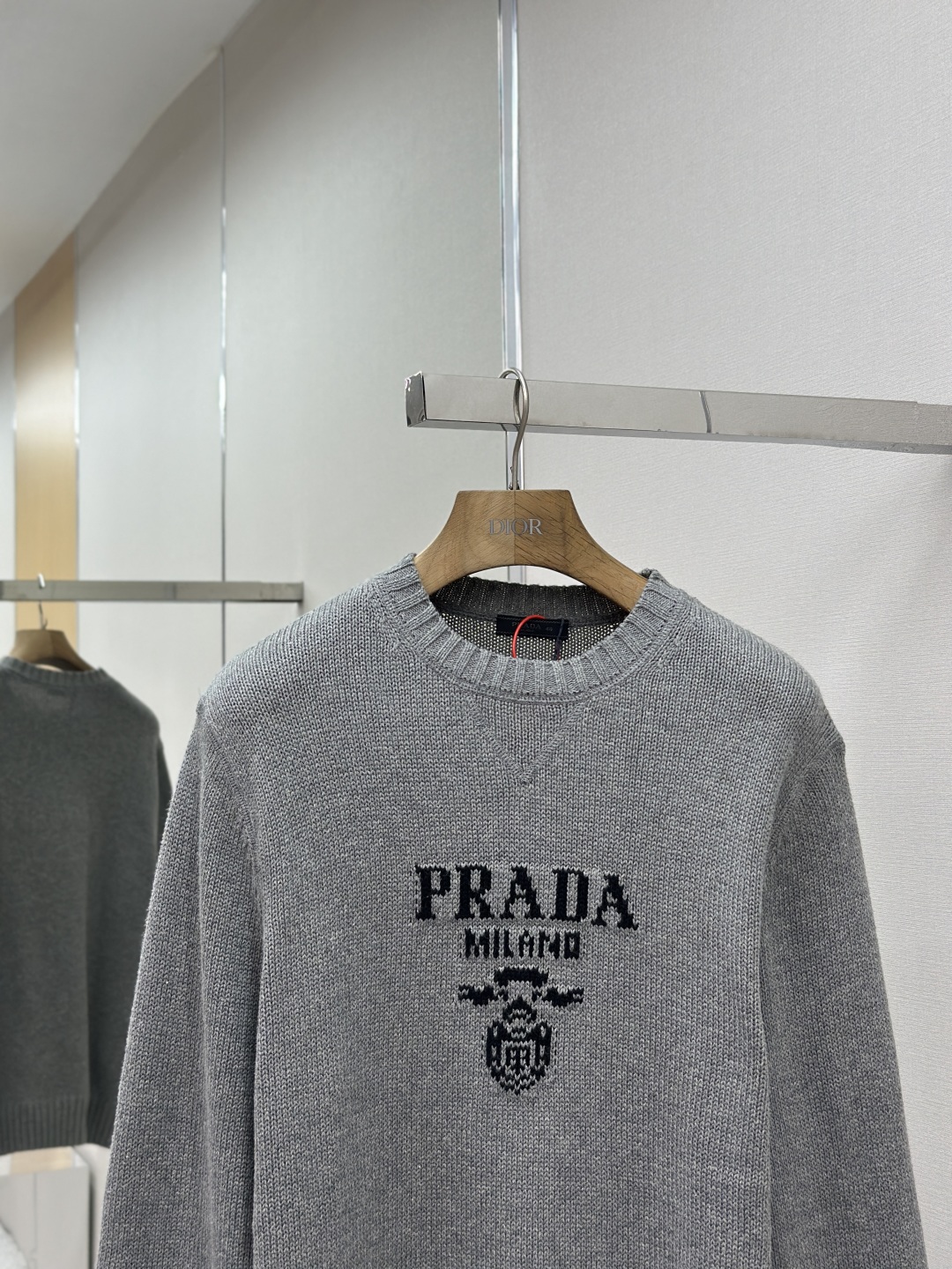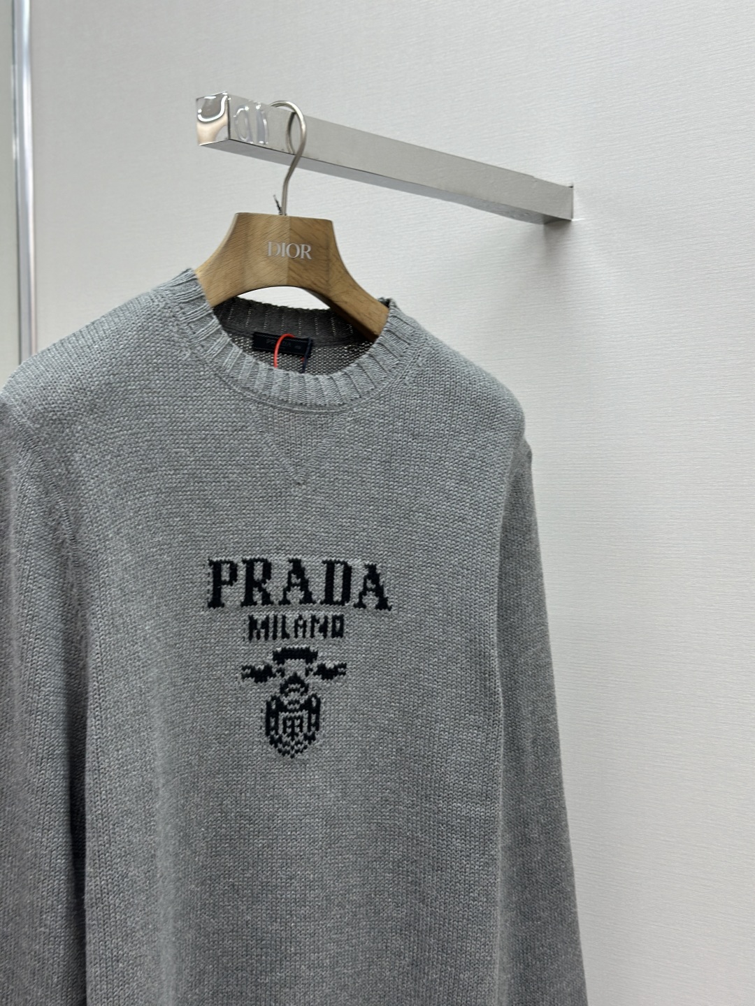 標誌性 Prada 徽標以提花方式醒目呈現,與領口三角區的獨特拼接設計相得益彰,進一步提升品牌辨識度。