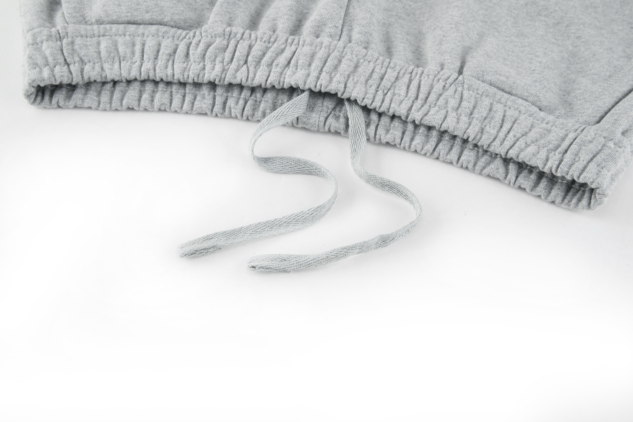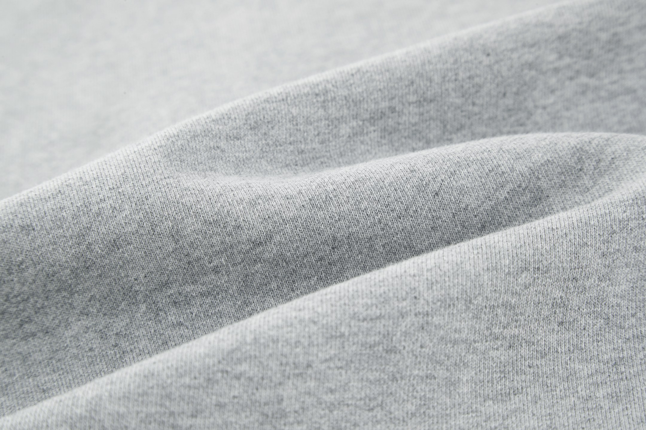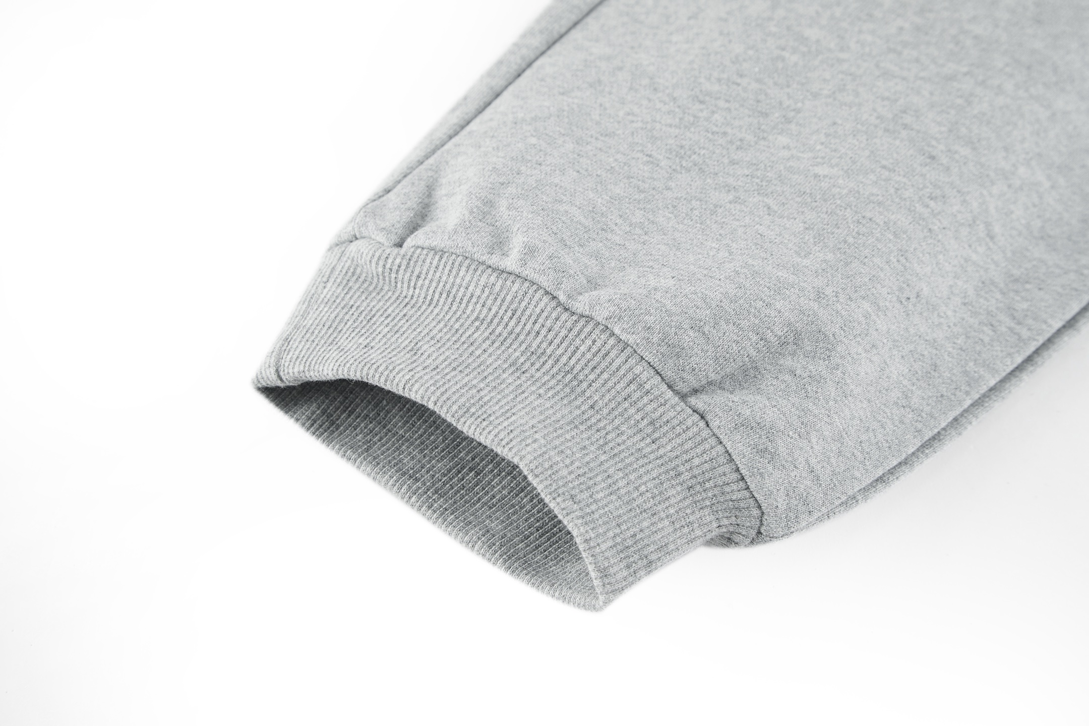 採用 380 克雙股魚鱗毛圈面料,此款衛褲原版定染深花灰色系,並選用 480 克雙紗同缸定染羅紋面料。