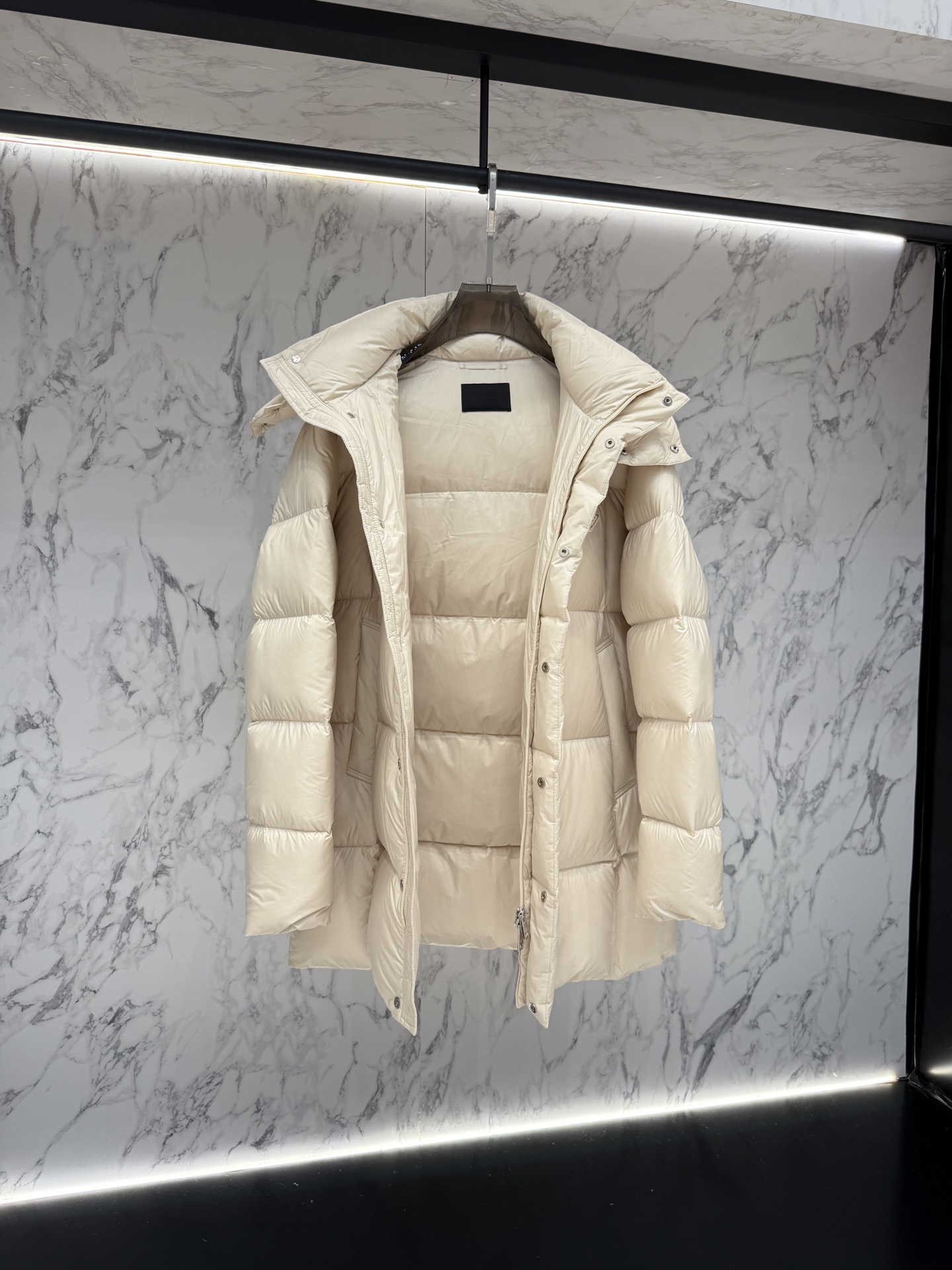 填充 95% 白鴨絨以提供更優異的保暖防護,搭配標誌性塗琺瑯金屬三角徽標,更能凸顯品牌格調。